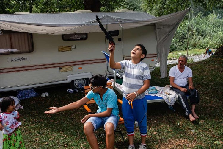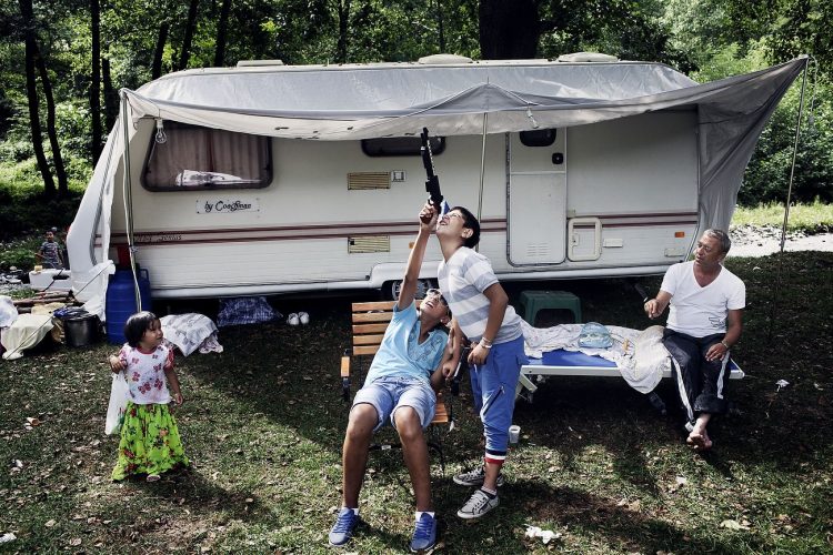 Romanian kids of roma origins play with gun toys during the traditional ethnic Roma festival in Costesti, 210 km (128 miles) west of Bucharest, September 8, 2011. Following their tradition, thousands of Roma from all over Romania, which has Europe's largest Roma community, gather every year to celebrate the birthday of St. Mary, to make wedding arrangements for their sons and daughters and to show off their wealth.