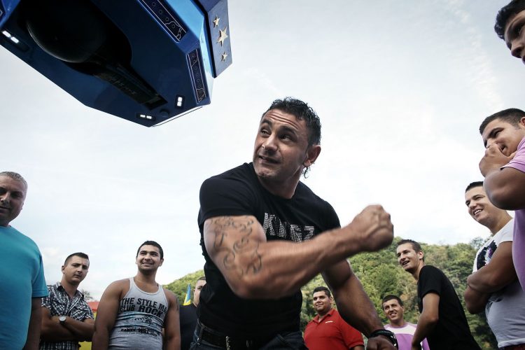 Roma man tests his strength during the traditional ethnic Roma festival in Costesti, 210 km (128 miles) west of Bucharest, September 8, 2011. Following their tradition, thousands of Roma from all over Romania, which has Europe's largest Roma community, gather every year to celebrate the birthday of St. Mary, to make wedding arrangements for their sons and daughters and to show off their wealth.