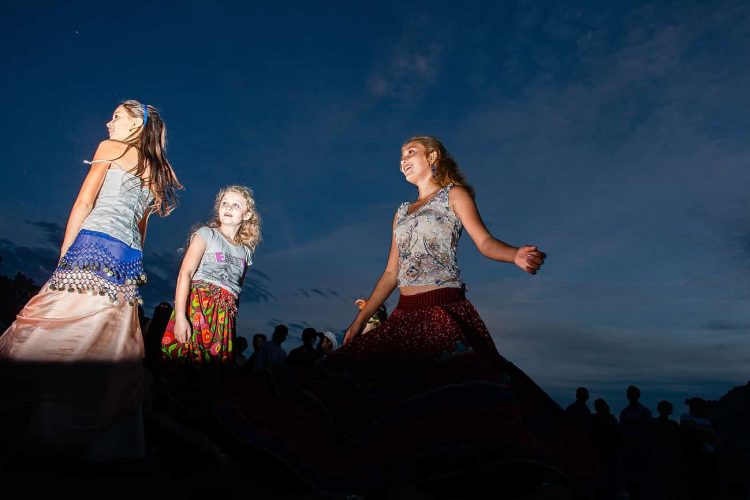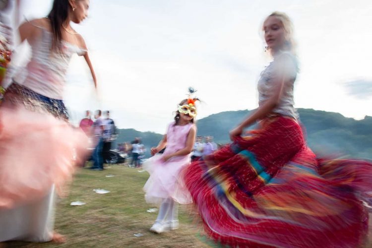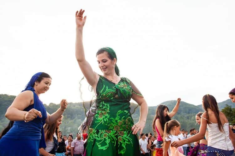 Roma girls dance as gathered people watch during the traditional ethnic Roma festival in Costesti, 210 km (128 miles) west of Bucharest, September 8, 2011. Following their tradition, thousands of Roma from all over Romania, which has Europe's largest Roma community, gather every year to celebrate the birthday of St. Mary, to make wedding arrangements for their sons and daughters and to show off their wealth.
