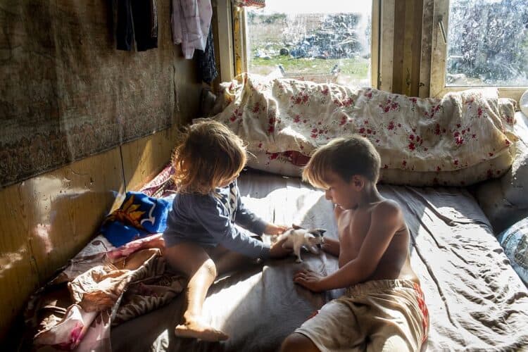 EFORIE SUD, ROMANIA - SEP 06: Suliman Elvis (L), Dali (M) and Suliman Armando (R) playing with a kitty in Eforie Sud, on September 06, 2022. Roma community living near a new municipal refuse site at Eforie Sud in the Northern Dobruja region of Romania, struggle without electricity and running water and face imminent evictions after the city-hall claimed in court that the community lacks proper tenure since 2015. Regardless of international pressure to stop such practices, local authorities continue to forcibly evict the remaining Roma people, including young children, often leaving them with no shelter facing extreme weather conditions and a lack of food.