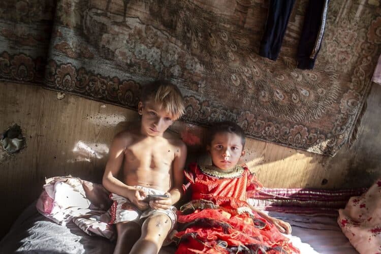 EFORIE SUD, ROMANIA - SEP 06: Dali (L) and Suliman Armando (R) inside a container in Eforie Sud, on September 06, 2022. Roma community living near a new municipal refuse site at Eforie Sud in the Northern Dobruja region of Romania, struggle without electricity and running water and face imminent evictions after the city-hall claimed in court that the community lacks proper tenure since 2015. Regardless of international pressure to stop such practices, local authorities continue to forcibly evict the remaining Roma people, including young children, often leaving them with no shelter facing extreme weather conditions and a lack of food.