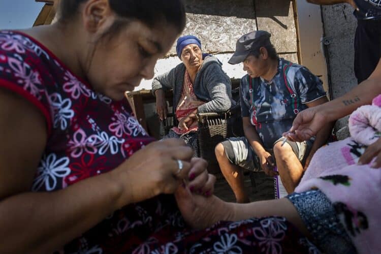 EFORIE SUD, ROMANIA - SEP 06: Suliman Edie (L) is painting the nails of Mustafa Anife (R) while Memet Emine and Ahmet Anife chat in Eforie Sud, on September 06, 2022. Roma community living near a new municipal refuse site at Eforie Sud in the Northern Dobruja region of Romania, struggle without electricity and running water and face imminent evictions after the city-hall claimed in court that the community lacks proper tenure since 2015. Regardless of international pressure to stop such practices, local authorities continue to forcibly evict the remaining Roma people, including young children, often leaving them with no shelter facing extreme weather conditions and a lack of food.
