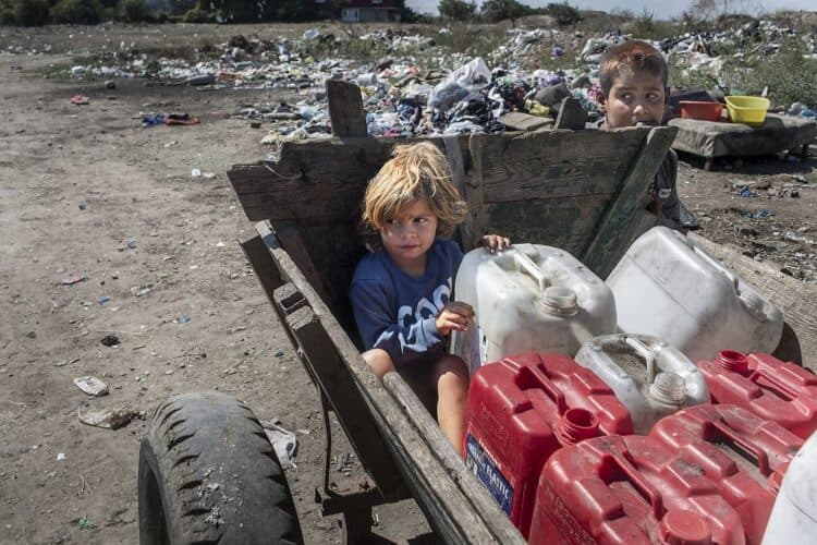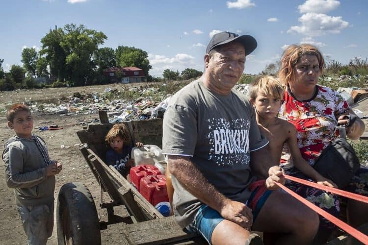 EFORIE SUD, ROMANIA - SEP 06: From left to right, Iusmen Cadir, Suliman Suliman Elvis, Iusmen Cadir, Dali, Suliman Emine, going to bring water for the community in Eforie Sud, on September 06, 2022. Roma community living near a new municipal refuse site at Eforie Sud in the Northern Dobruja region of Romania, struggle without electricity and running water and face imminent evictions after the city-hall claimed in court that the community lacks proper tenure since 2015. Regardless of international pressure to stop such practices, local authorities continue to forcibly evict the remaining Roma people, including young children, often leaving them with no shelter facing extreme weather conditions and a lack of food.