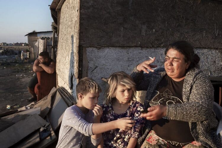EFORIE SUD, ROMANIA - SEP 06: Saban Guler (R) and her children, in Eforie Sud, on September 06, 2022. Roma community of Turkish origin living near a new municipal refuse site at Eforie Sud in the Northern Dobruja region of Romania, struggle without electricity and running water and face imminent evictions after the city-hall claimed in court that the community lacks proper tenure since 2015. Regardless of international pressure to stop such practices, local authorities continue to forcibly evict the remaining Roma people, including young children, often leaving them with no shelter facing extreme weather conditions and a lack of food.