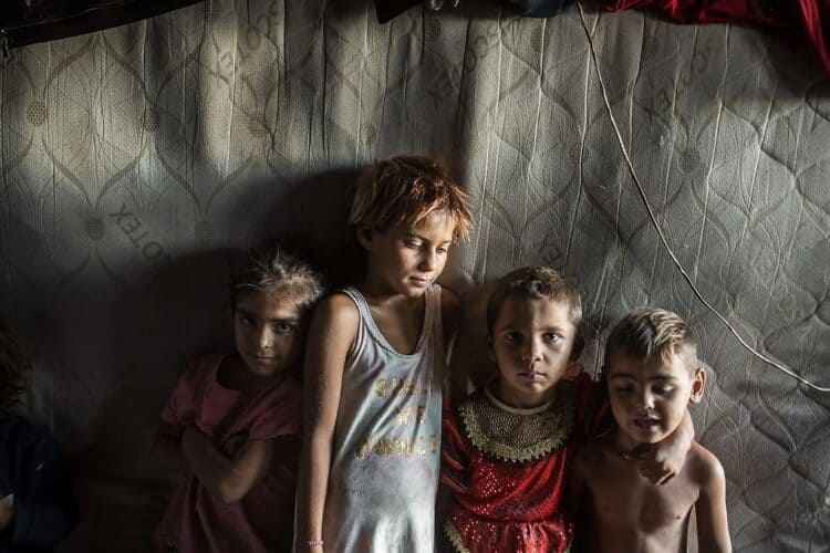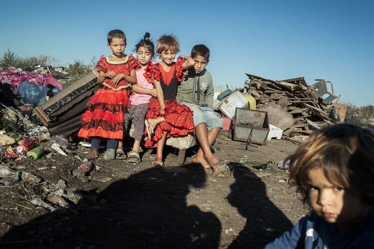 EFORIE SUD, ROMANIA - SEP 06: Roma kids of Turkish origin playing in Eforie Sud, on September 06, 2022. Roma community living near a new municipal refuse site at Eforie Sud in the Northern Dobruja region of Romania, struggle without electricity and running water and face imminent evictions after the city-hall claimed in court that the community lacks proper tenure since 2015. Regardless of international pressure to stop such practices, local authorities continue to forcibly evict the remaining Roma people, including young children, often leaving them with no shelter facing extreme weather conditions and a lack of food.