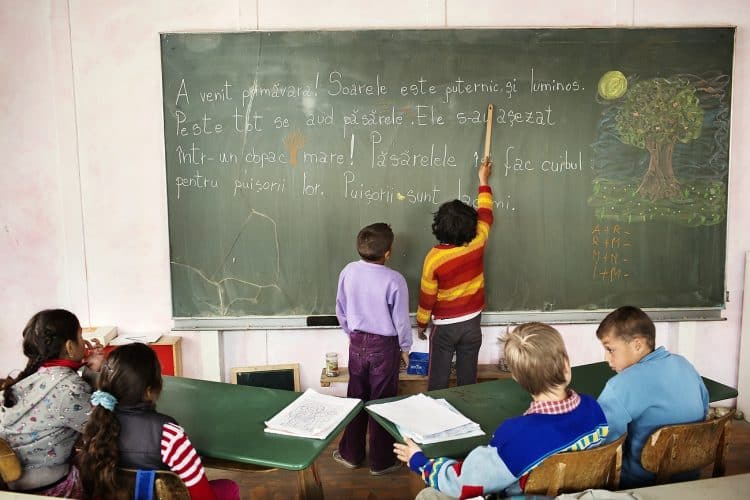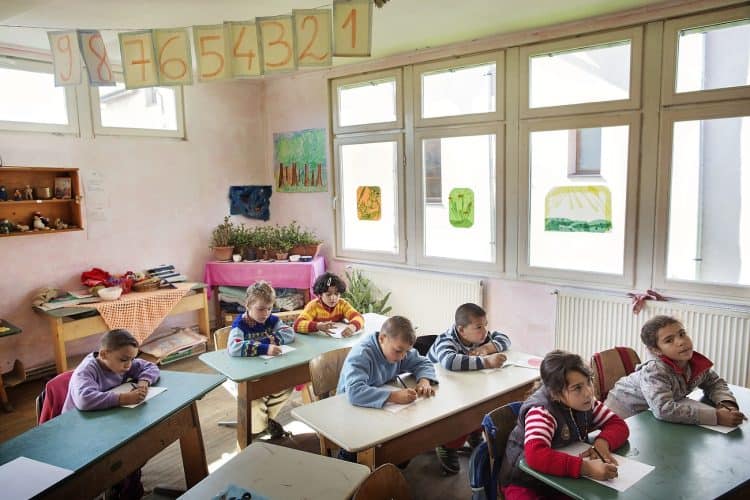 Romanian kids of Roma origins seen during class in Waldorf School for Roma kids in Rosia on May 6, 2014. The Waldorf School in nearby Sibiu founded the Hans Spalinger School. It started in 1998 as a literacy program for children from the Roma minority, and in 2000, the initiative was officially approved by the School Inspectorate in Sibiu as a public Waldorf school, and was then eventually extended by a vocational course with the emphasis on agriculture in 2004. Unfortunately, all vocational schools were abolished in Romania in 2009 and therefore, the school has to fight for a new official recognition by the Ministry for its professional training. Since September 2010, the school also has a kindergarten class, which is supported by the Waldorf association and is additionally funded through donations from Switzerland.