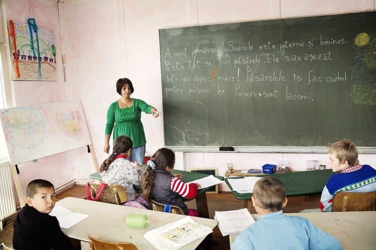 Leila Gabor, a Romanian teacher of Roma origins gestures while attending class at Waldorf school for Roma kids, as seen in Rosia on May 6, 2014. The Waldorf School in nearby Sibiu founded the Hans Spalinger School. It started in 1998 as a literacy program for children from the Roma minority, and in 2000, the initiative was officially approved by the School Inspectorate in Sibiu as a public Waldorf school, and was then eventually extended by a vocational course with the emphasis on agriculture in 2004. Unfortunately, all vocational schools were abolished in Romania in 2009 and therefore, the school has to fight for a new official recognition by the Ministry for its professional training. Since September 2010, the school also has a kindergarten class, which is supported by the Waldorf association and is additionally funded through donations from Switzerland.
