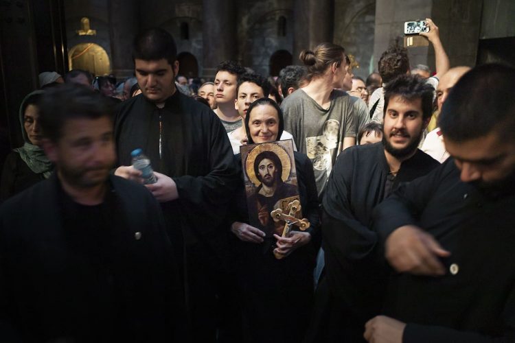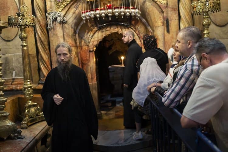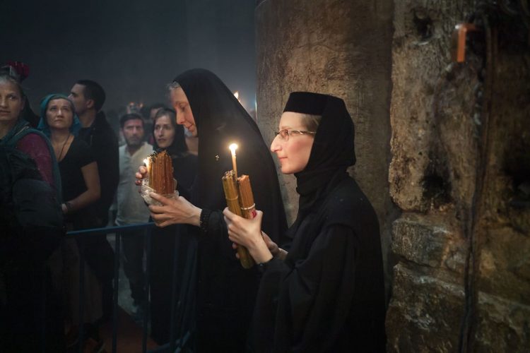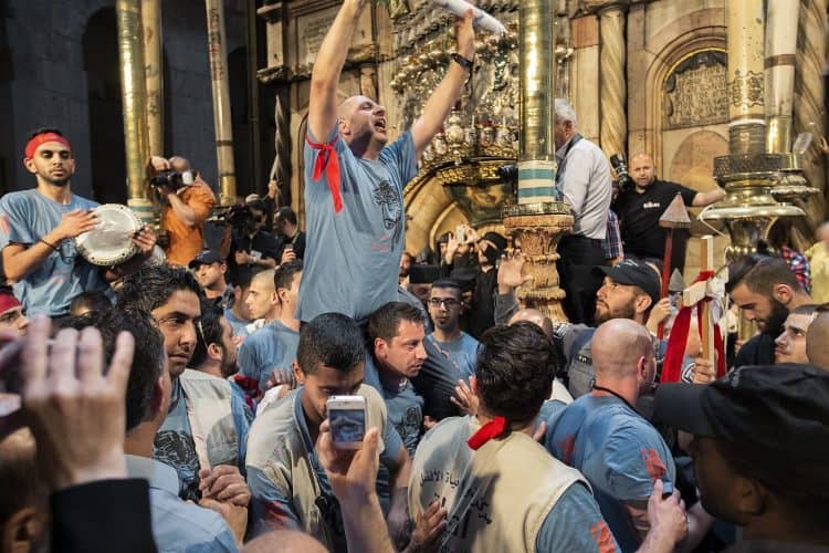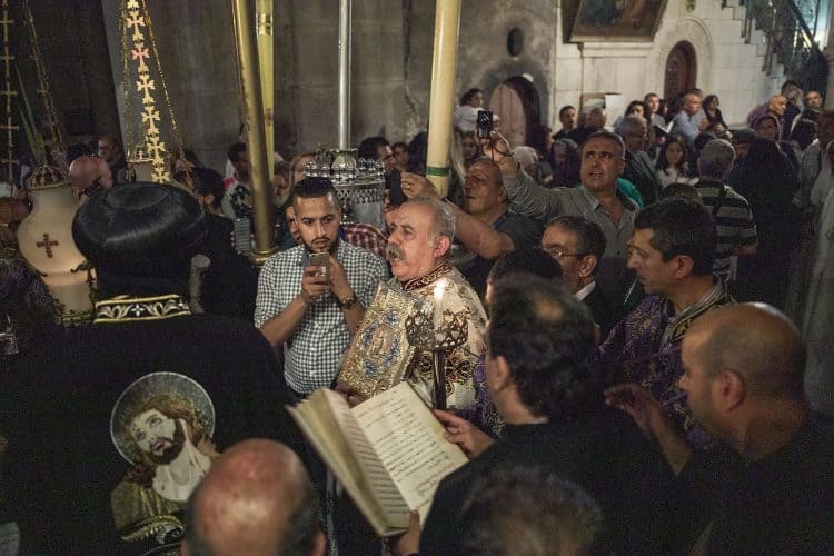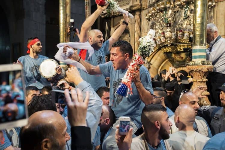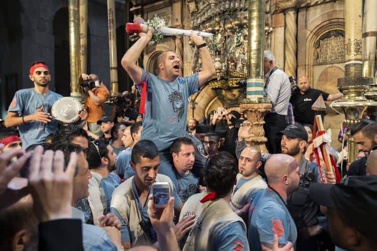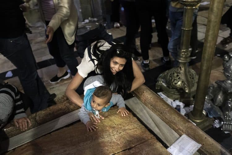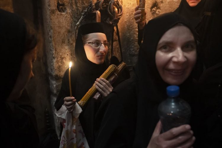 Christian Orthodox as seen inside the church of the Holy Sepulcher, traditionally believed to be the burial site of Jesus Christ, May 1, 2016 in Jerusalem. On April 30, thousands of Christians have gathered in Jerusalem for the ancient fire ceremony that celebrates Jesus' resurrection.