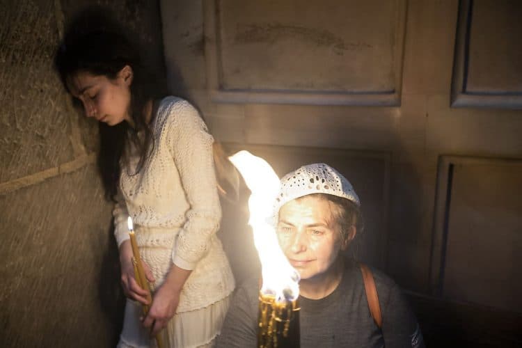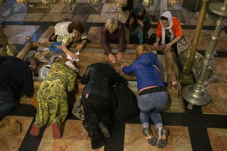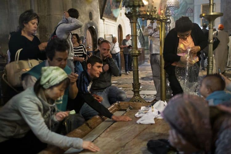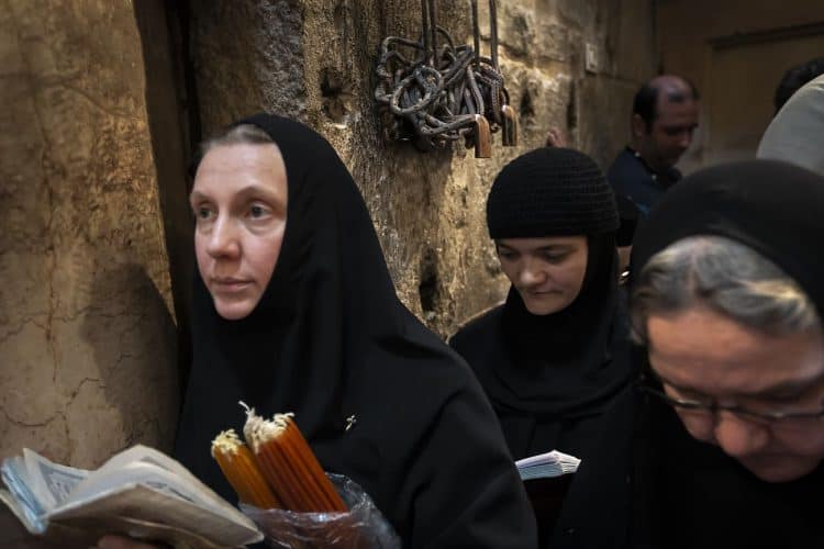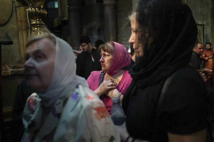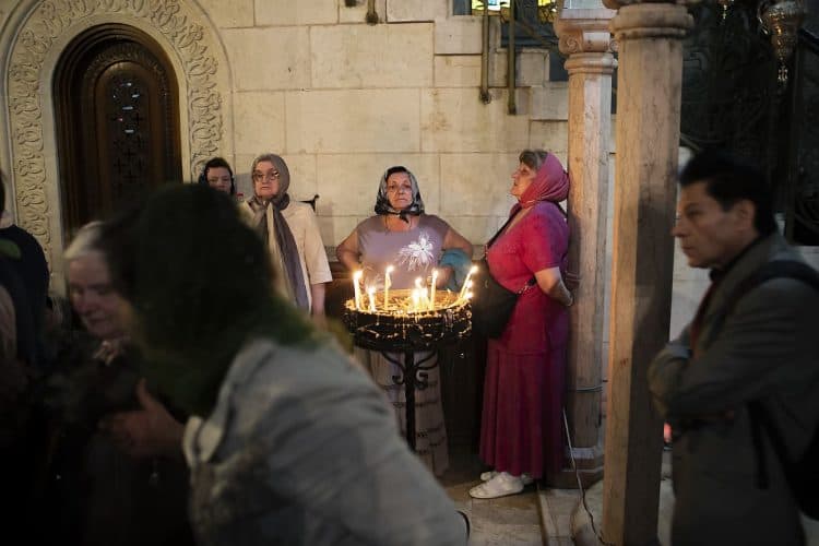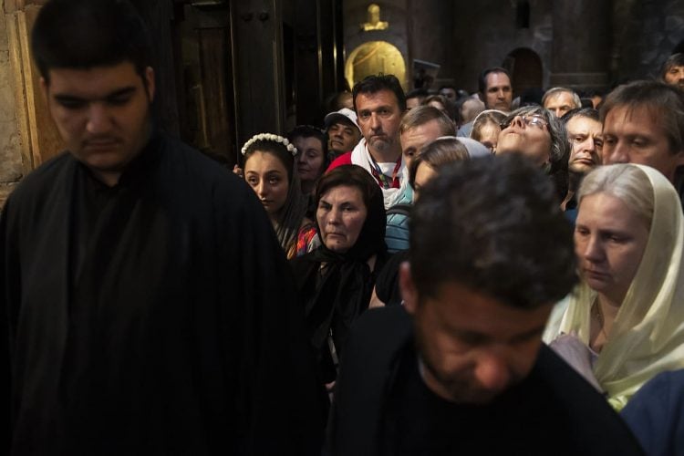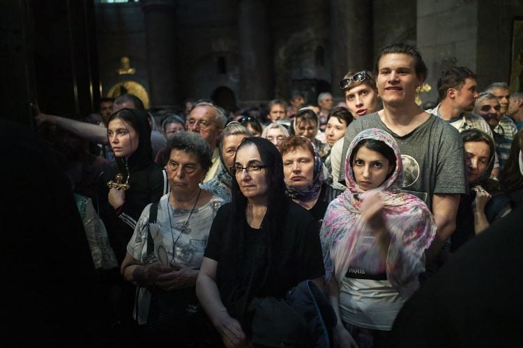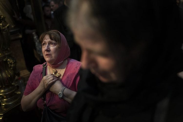 Christian Orthodox pilgrims as seen inside the church of the Holy Sepulcher, traditionally believed to be the burial site of Jesus Christ, April 29, 2016 in Jerusalem. Thousands of Christians are expected in Jerusalem for the ancient fire ceremony that celebrates Jesus' resurrection.