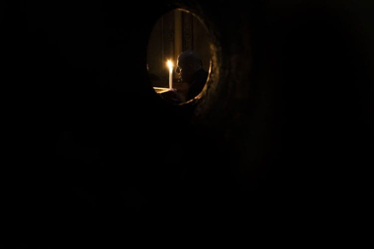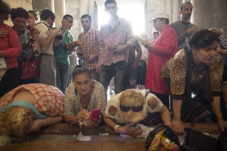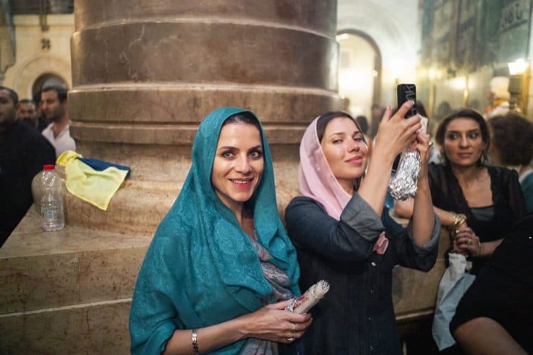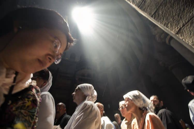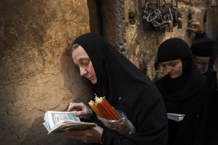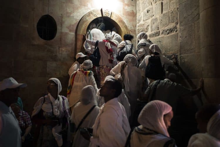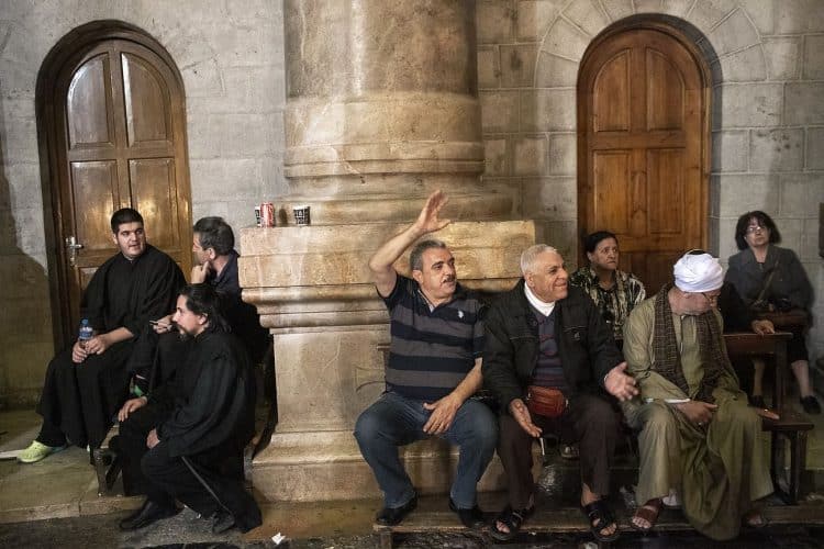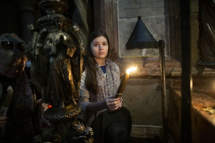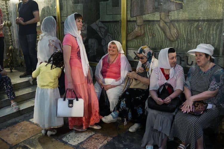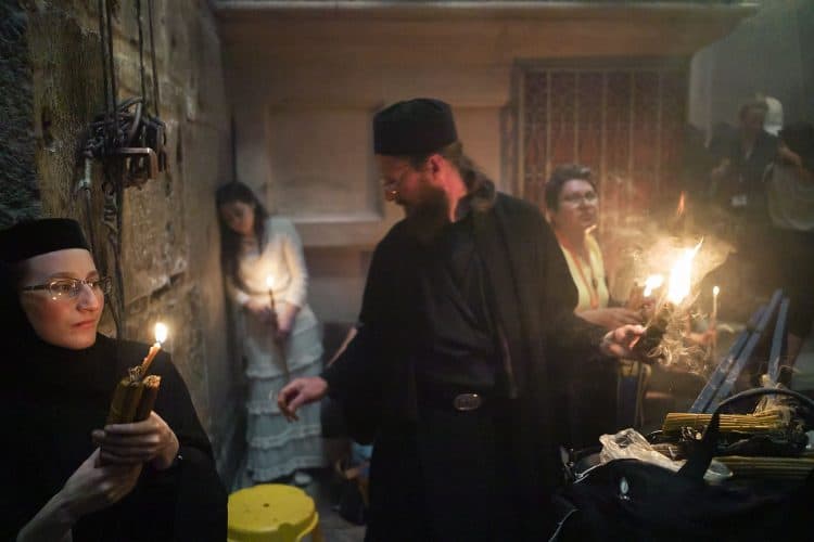 Christian Orthodox pilgrims as seen inside the church of the Holy Sepulcher, traditionally believed to be the burial site of Jesus Christ, April 29, 2016 in Jerusalem. Thousands of Christians are expected in Jerusalem for the ancient fire ceremony that celebrates Jesus' resurrection.