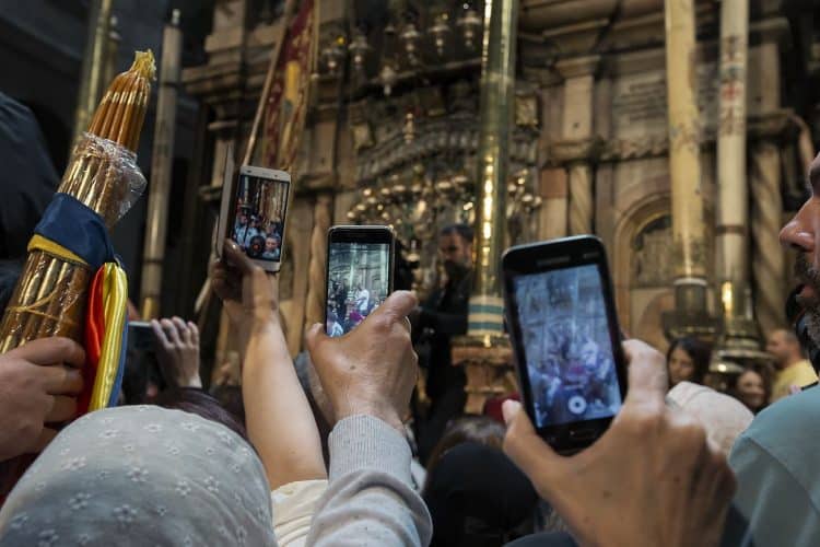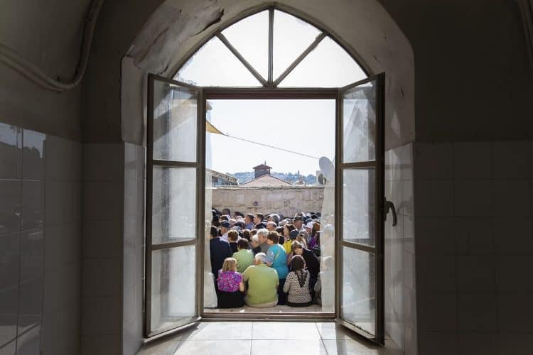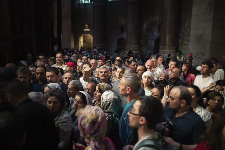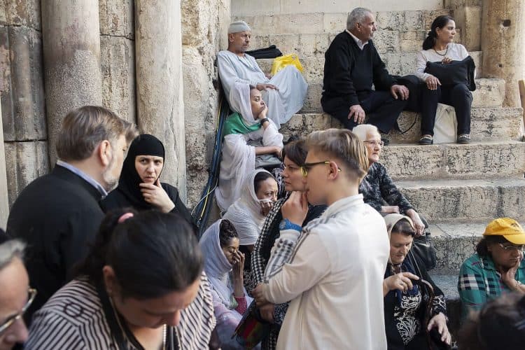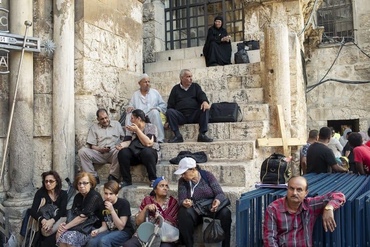 JERUSALEM, ISRAEL - APR 29: People outside the church of the Holy Sepulcher, in Jerusalem on April 29, 2019. Thousands of Christians are expected in Jerusalem on April 30 for the ancient fire ceremony that celebrates Jesus' resurrection. © Mugur Varzariu