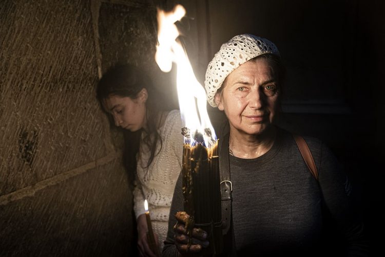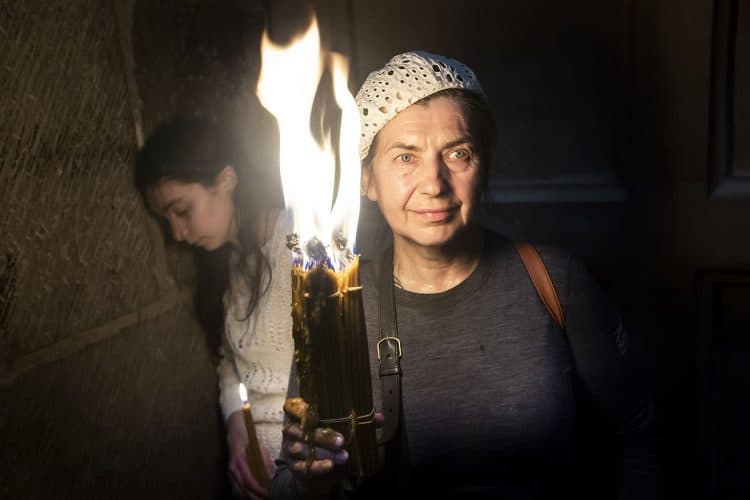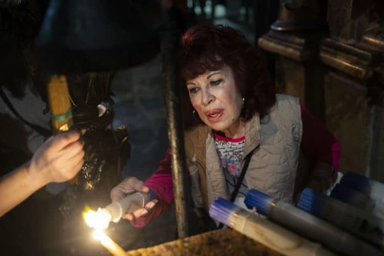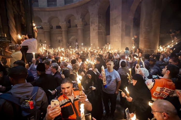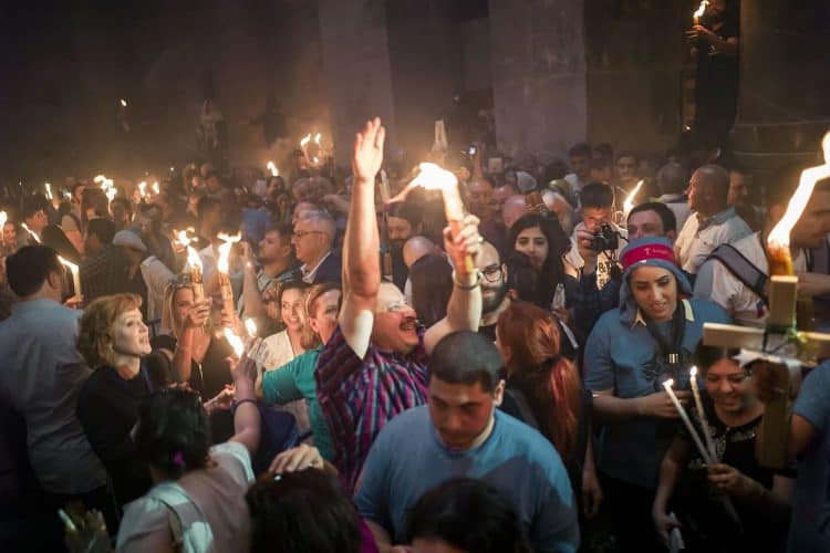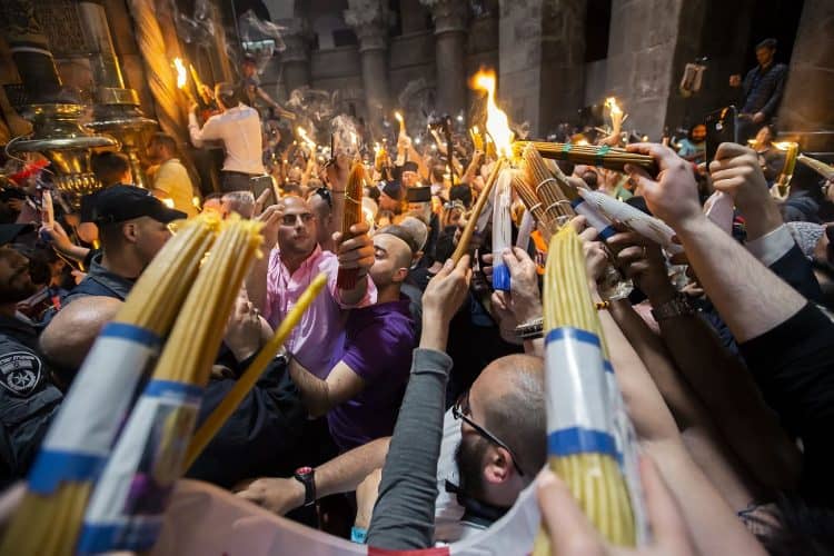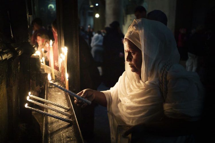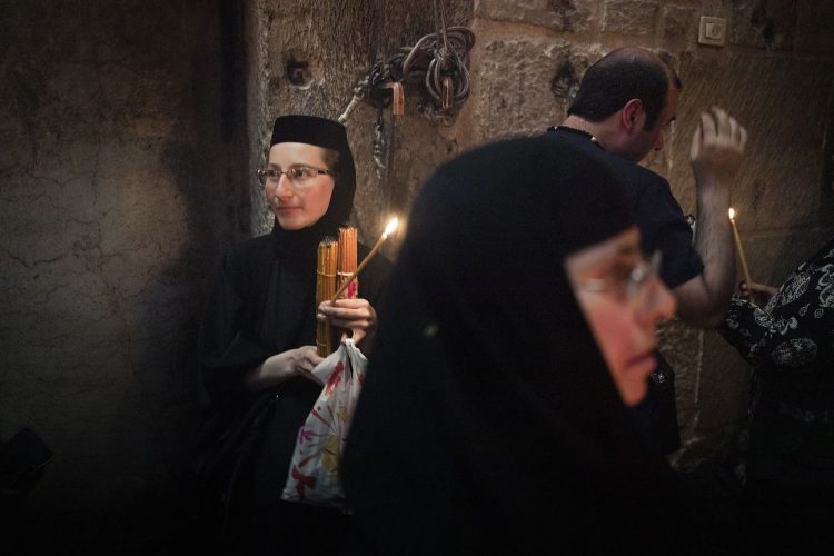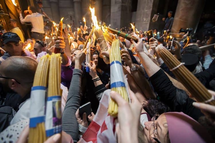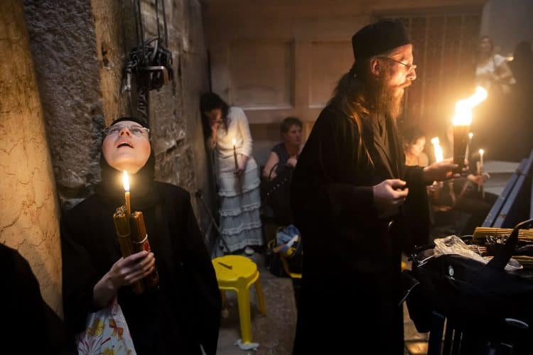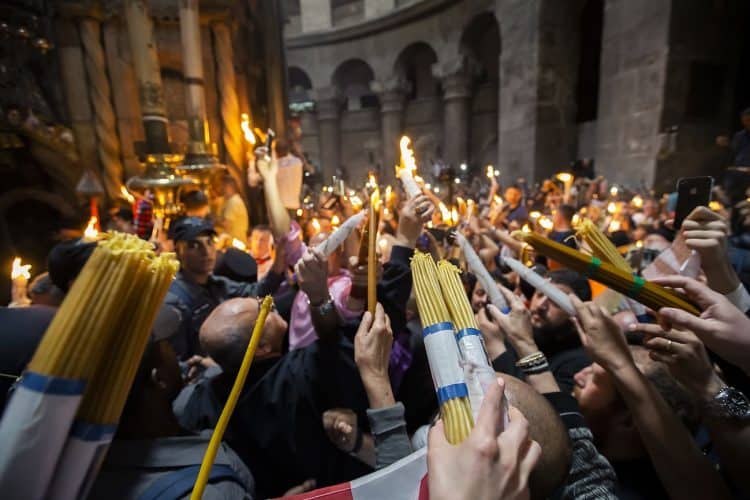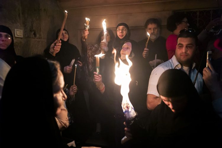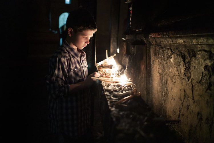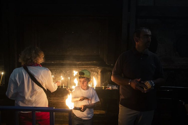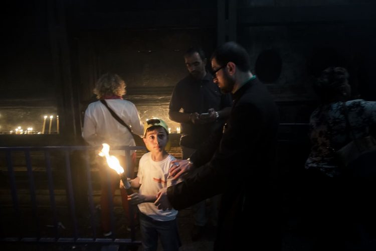 JERUSALEM, ISRAEL - MAY 1: A child lighting a candle inside the Church of the Holy Sepulcher in Jerusalem on May 1, 2019. Thousands of Christians gathered in Jerusalem on April 30 for the ancient fire ceremony that celebrates Jesus' resurrection. © Mugur Varzariu