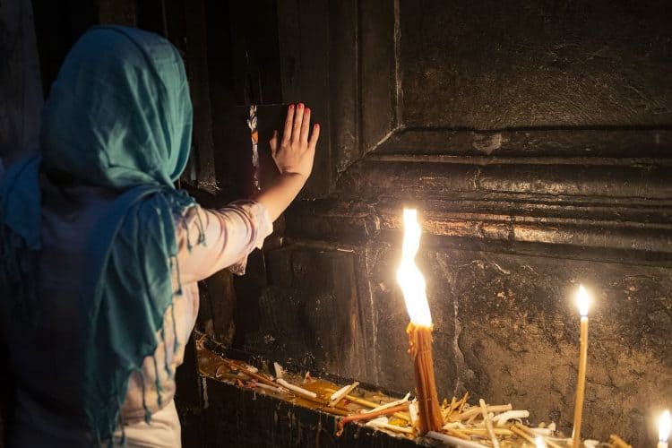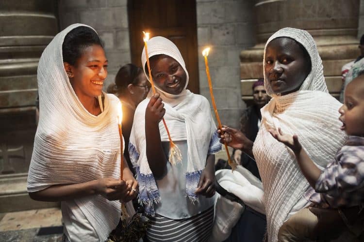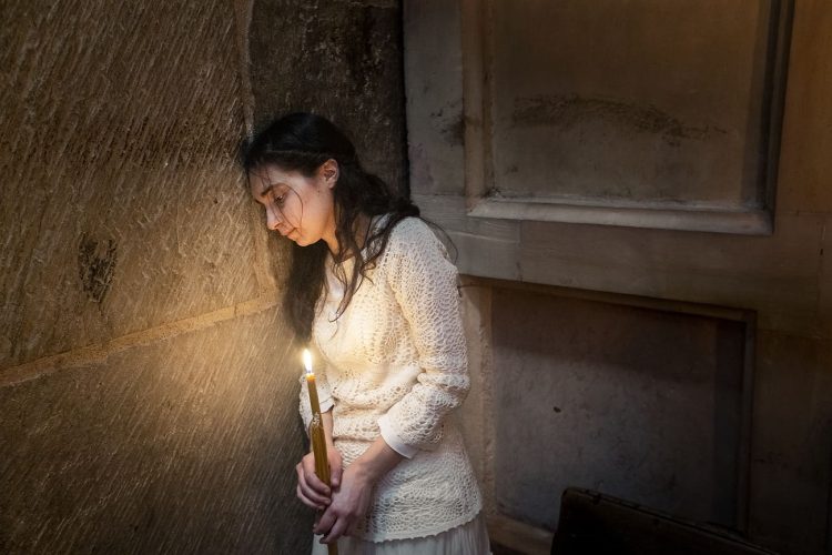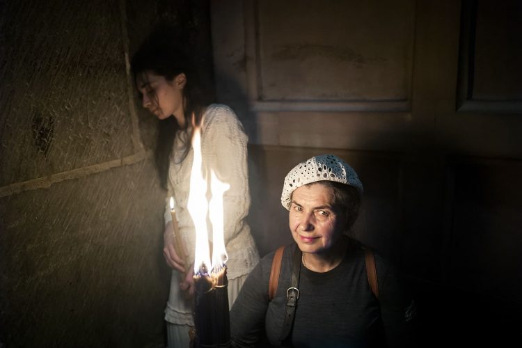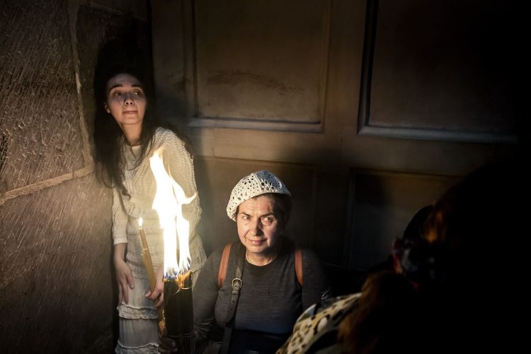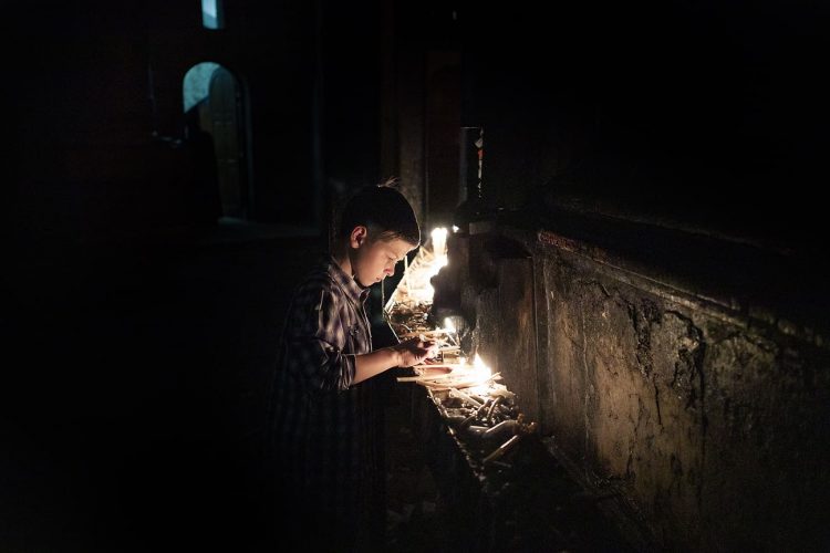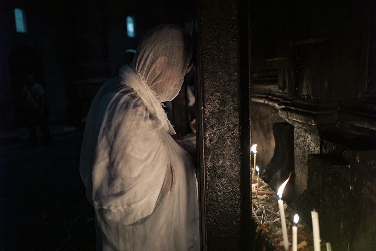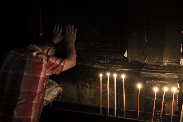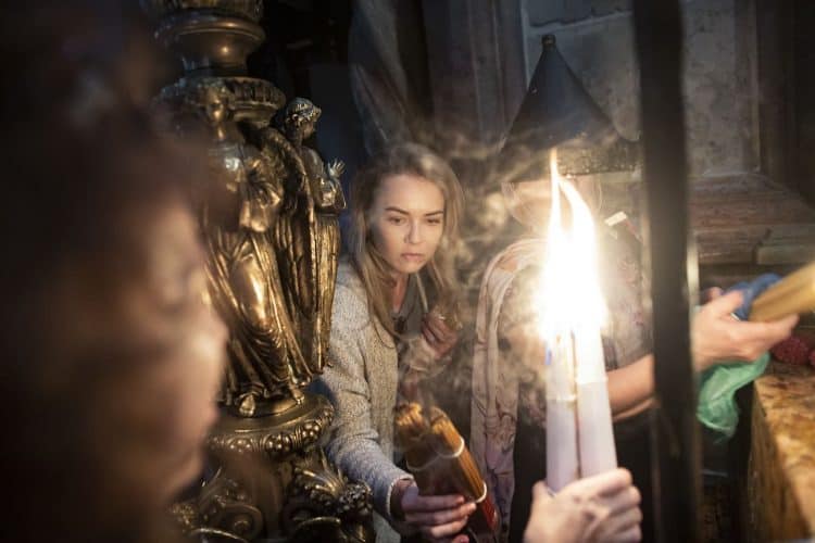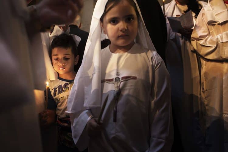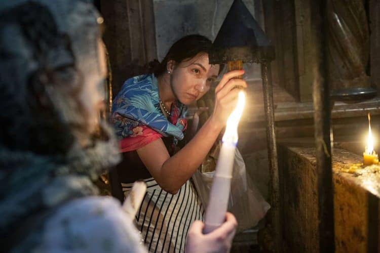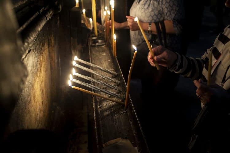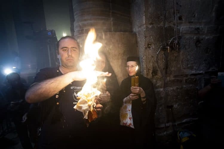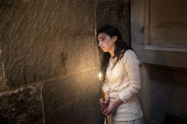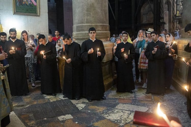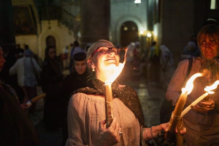 JERUSALEM, ISRAEL - MAY 1: A child lighting a candle inside the Church of the Holy Sepulcher in Jerusalem on May 1, 2019. Thousands of Christians gathered in Jerusalem on April 30 for the ancient fire ceremony that celebrates Jesus' resurrection. © Mugur Varzariu