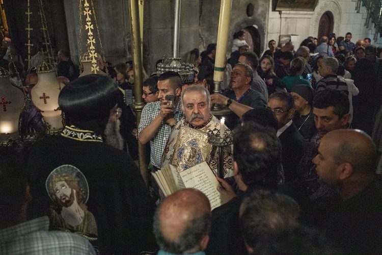 Christian Orthodox awaiting for the Holy Fire ceremony to start, in the church of the Holy Sepulcher, traditionally believed to be the burial site of Jesus Christ, Saturday, April 30, 2016 in Jerusalem. Thousands of Christians have gathered in Jerusalem for the ancient fire ceremony that celebrates Jesus' resurrection.