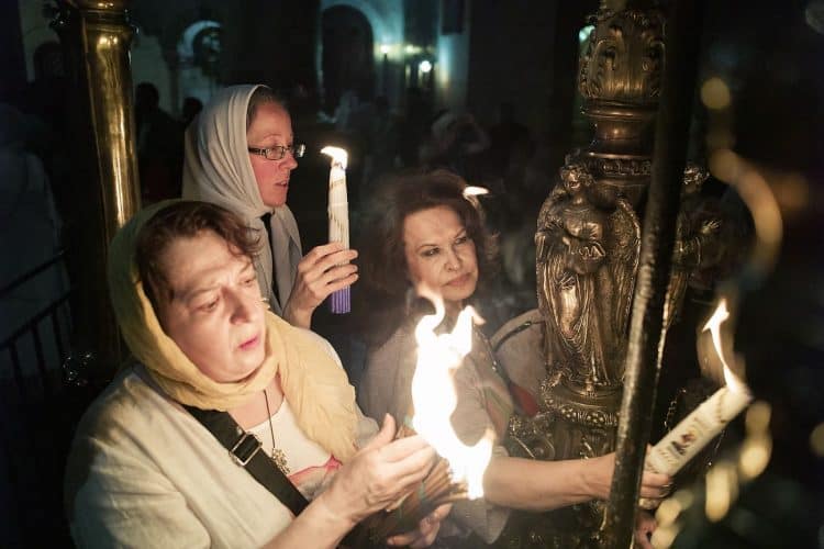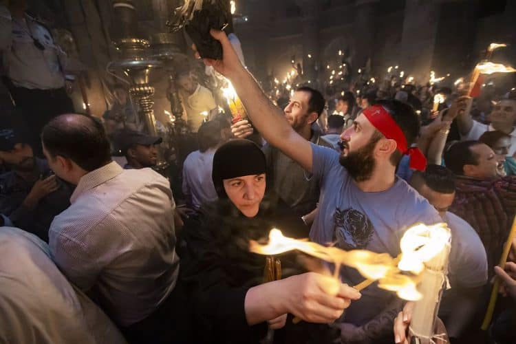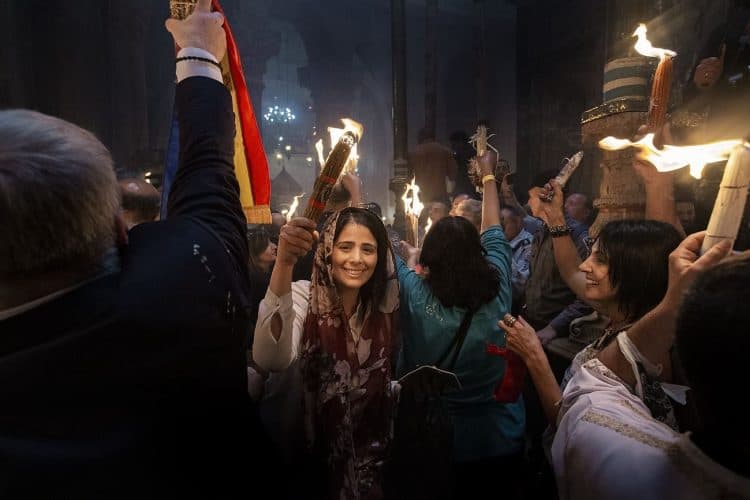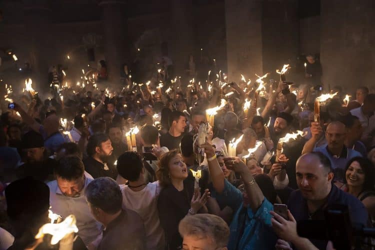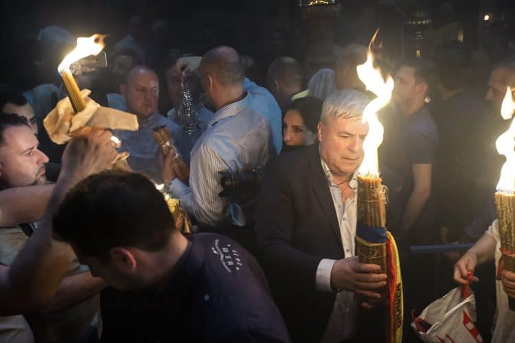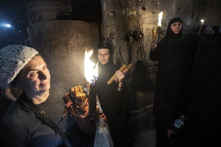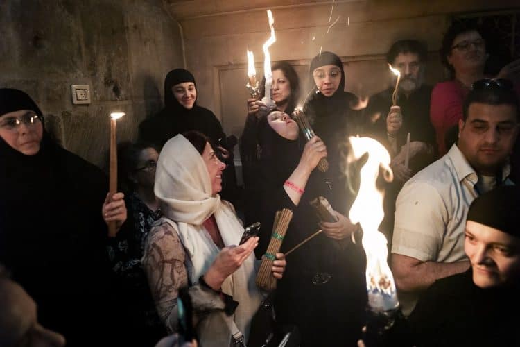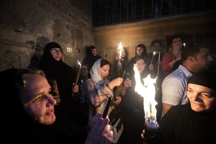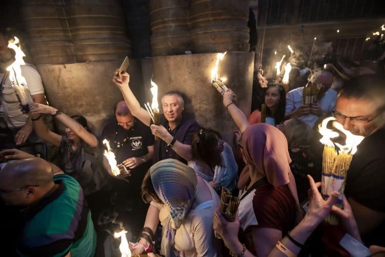 Christian Orthodox after the Holy Fire ceremony in the church of the Holy Sepulcher, traditionally believed to be the burial site of Jesus Christ, Saturday, April 30, 2016 in Jerusalem. Thousands of Christians have gathered in Jerusalem for the ancient fire ceremony that celebrates Jesus' resurrection.