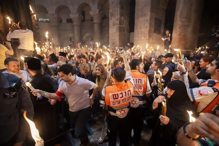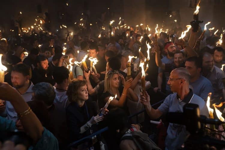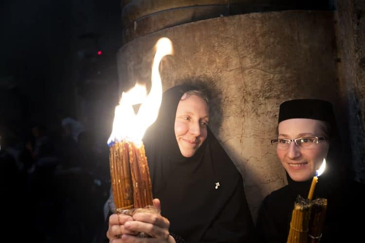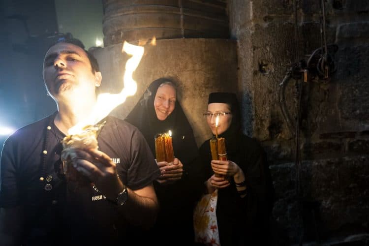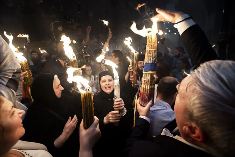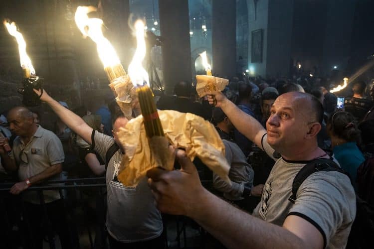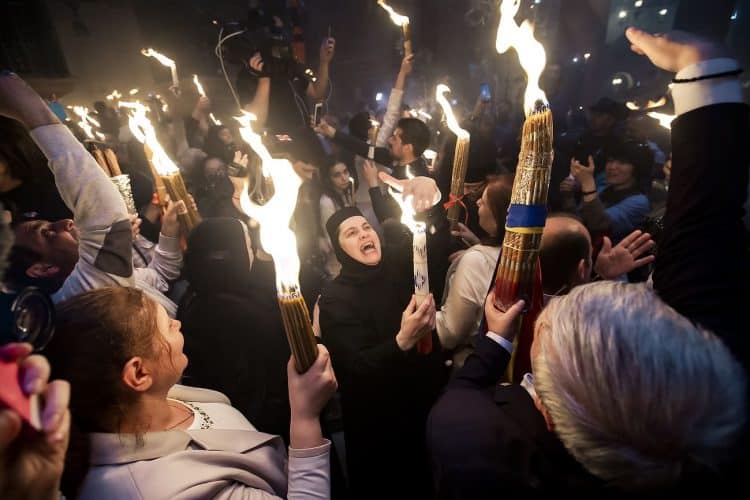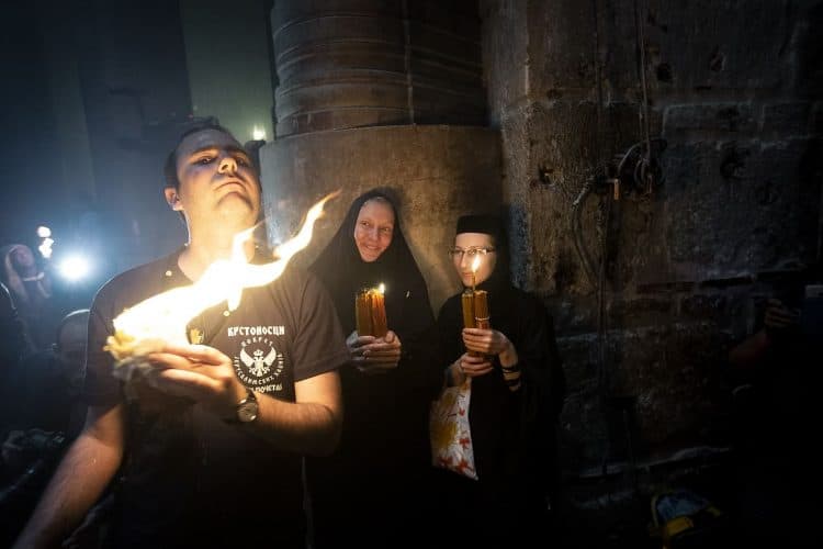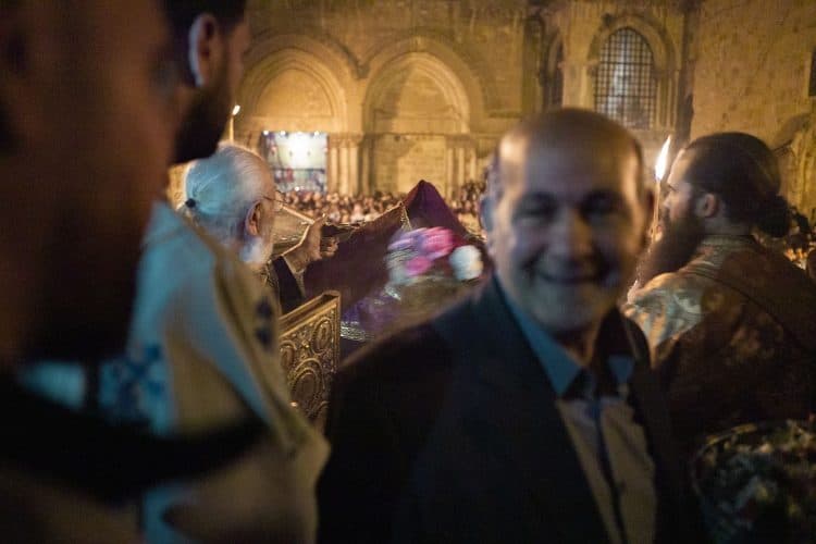 Christian Orthodox after the Holy Fire ceremony in the church of the Holy Sepulcher, traditionally believed to be the burial site of Jesus Christ, Saturday, April 30, 2016 in Jerusalem. Thousands of Christians have gathered in Jerusalem for the ancient fire ceremony that celebrates Jesus' resurrection.