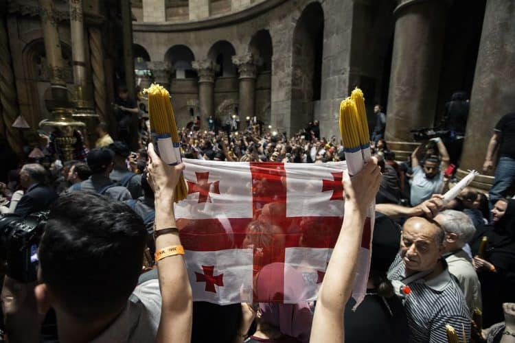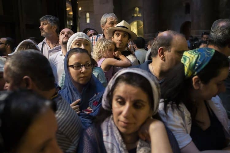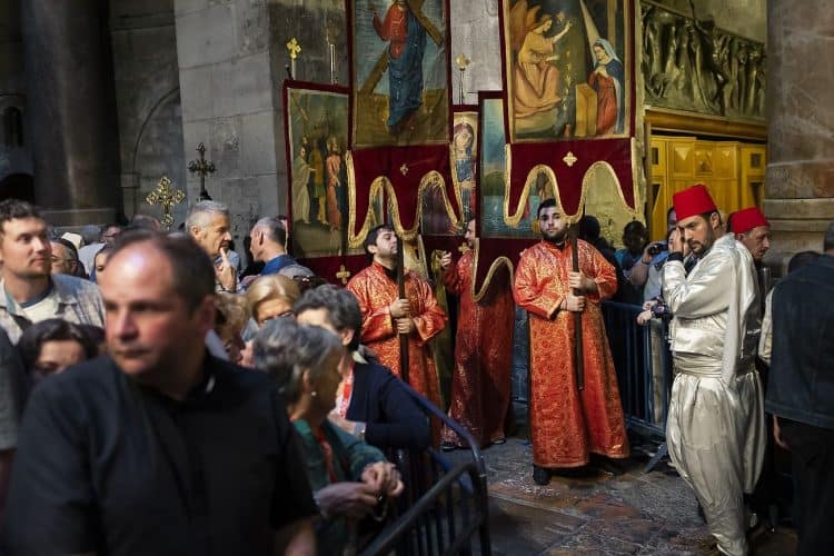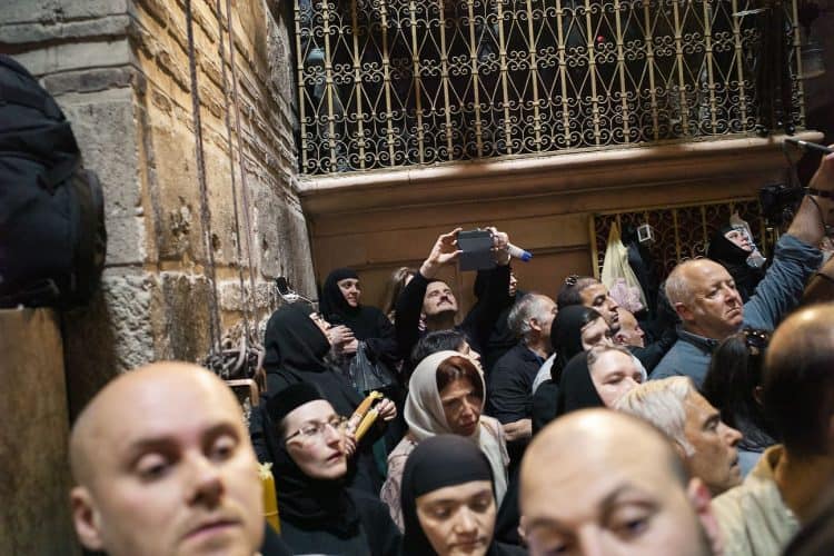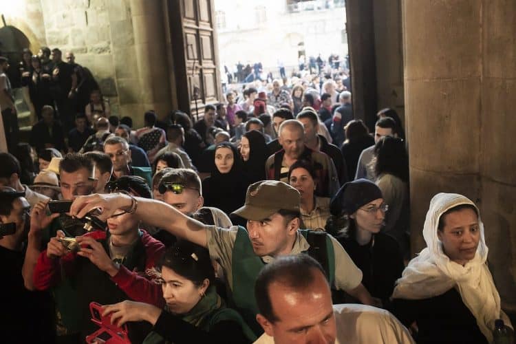 People outside the church of the Holy Sepulcher, as seen in Jerusalem on May 1, 2019. Thousands of Christians have gathered in Jerusalem on April 30 for the ancient fire ceremony that celebrates Jesus' resurrection.