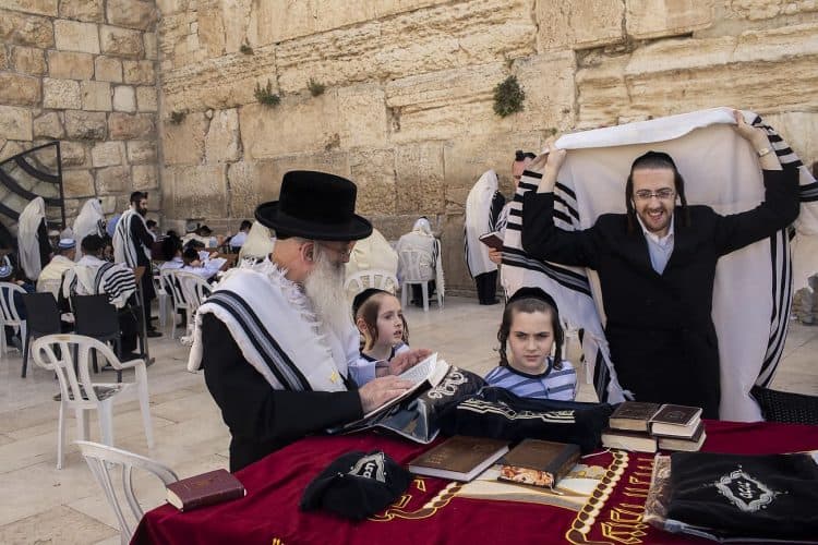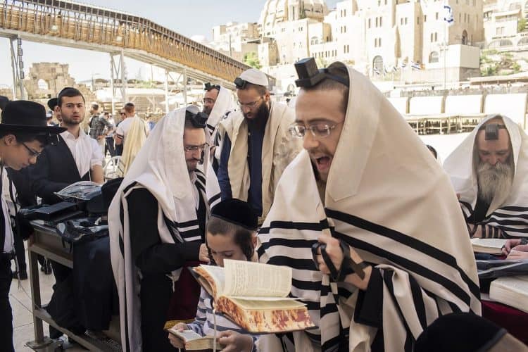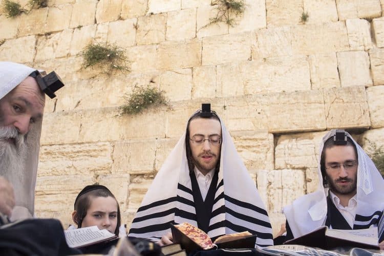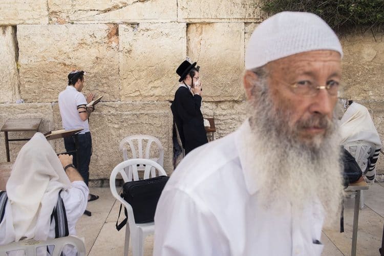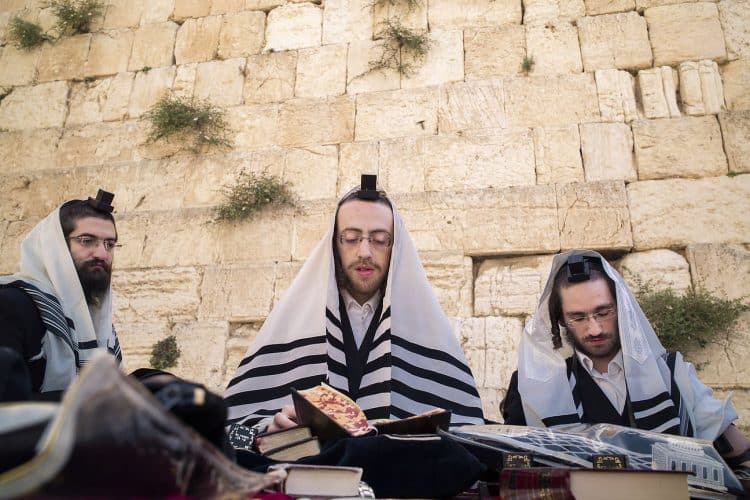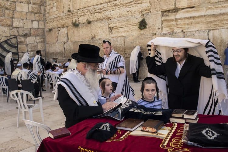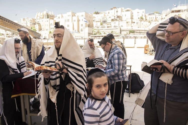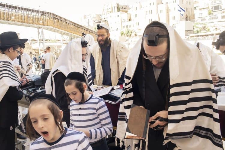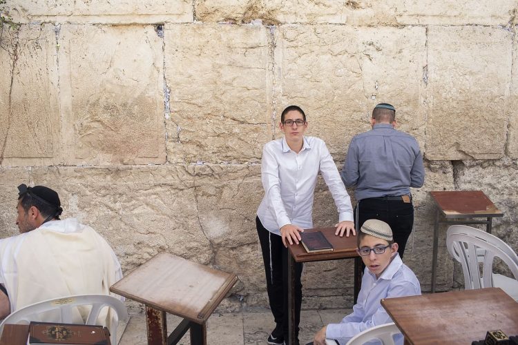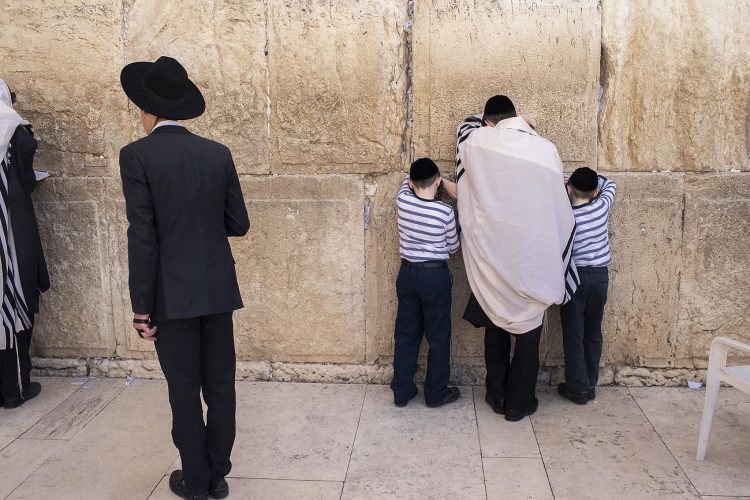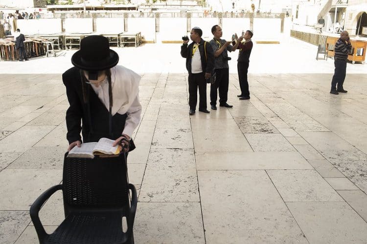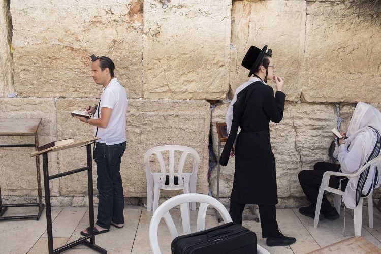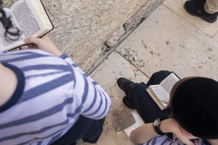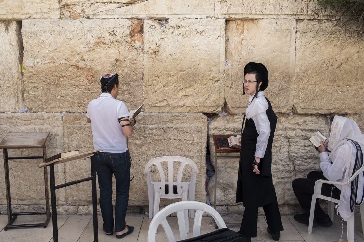Orthodox Jews pray before the Western Wall in Jerusalem and study the Torah, as seen in Jerusalem on May 1, 2019.